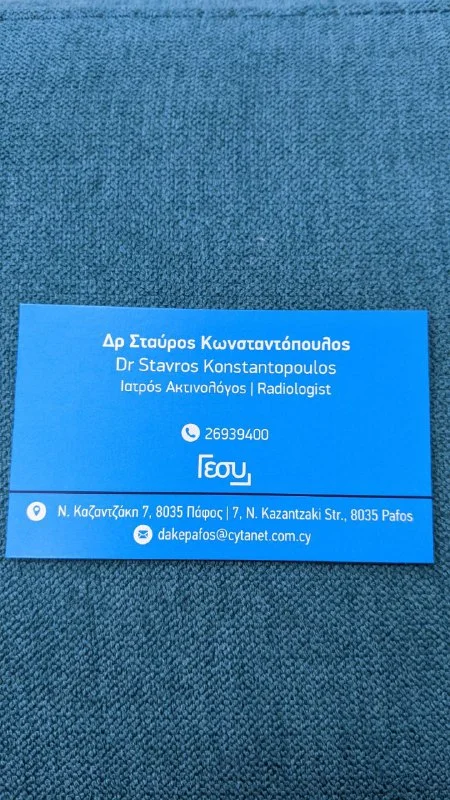 Пафос: УЗИ, Рентген не далеко от Next, Toybox. Принимает по Геси, без страховки, но за наличные. Говорит на английском/греческом. Можно заранее договориться ко времени, а можно приехать сразу. Без долгих очередей. Мою проблему нашел.