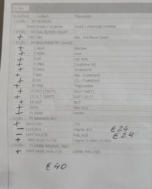 Заехала сегодня в новую лабораторию Synlab на Колонакиу , хорошие цены у них. Для примера на фото пакет для женщин 40€, включает даже Вит Д! Отдельно Вит В12 и фолиевая к-та по 24€