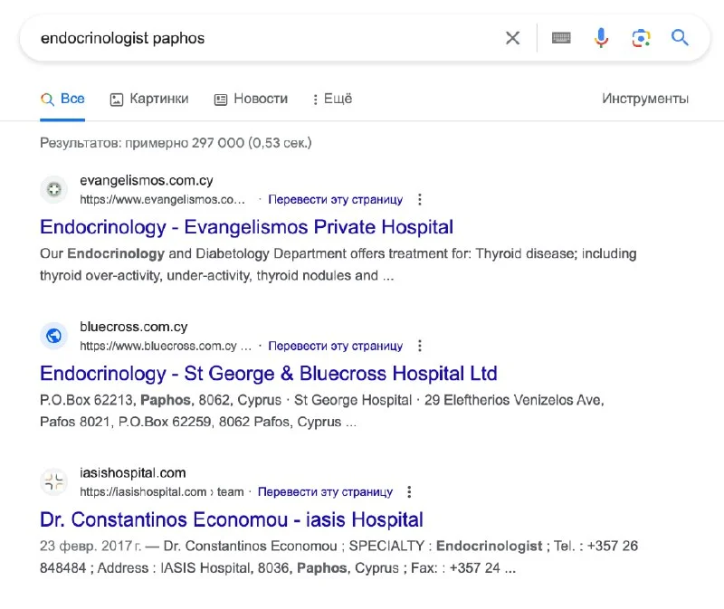 Добрый день всем! На сайте поиском не находит. Неужели нет эндокринолога в Пафосе? Посоветуйтес, пож. , вдруг у кого-то был хороший опыт.