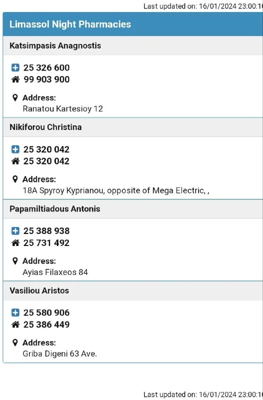 Подскажите пожалуйста есть ли аптеки которые работают сейчас в Лимассоле (после 22:00), все из списка закрыты, не понятно почему они считаются дежурными или ночными