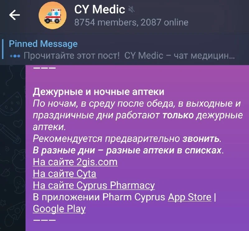 Подскажите пожалуйста есть ли аптеки которые работают сейчас в Лимассоле (после 22:00), все из списк...
