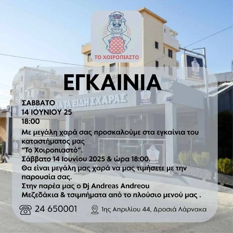 🍖 14 июня 2025 года в 18:00 откроется новое сувлаки-кафе «Хиропьясто» в Ларнаке.