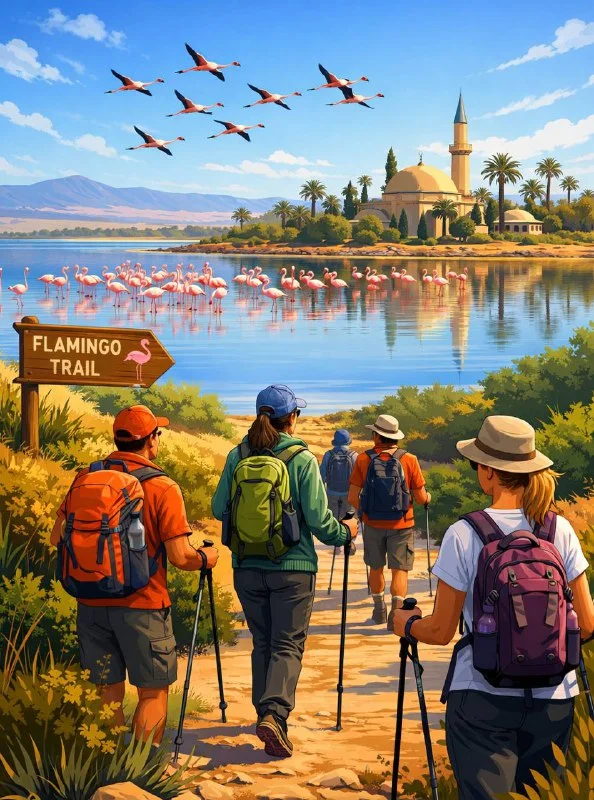 Походный клуб The Vounisious приглашает на живописный маршрут вдоль Солёного озера, где в это время года можно увидеть фламинго в естественной среде.