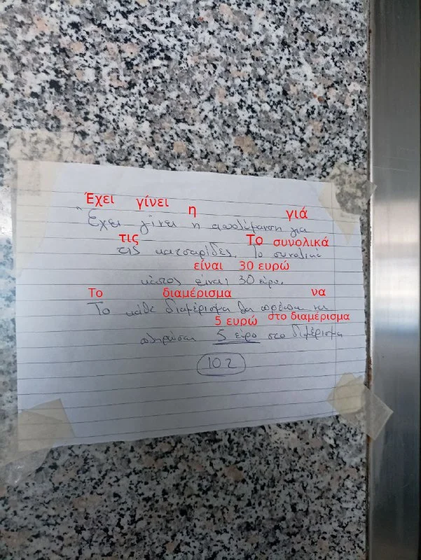 смысл я понял, что сделали что-то за 30 евро (кстати, странно ευρώ написано, или что там за иро?), и нужно по 5 сдать в квартиру 102, но просто интересно, что то за слова, я некоторые буквы вообще не узнаю