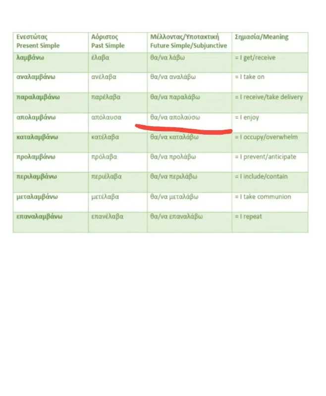 Сегодня от ученика поступил очень интересный вопрос. Почему все глаголы с основой - λαμβάνω - (θα λάβω) спрягаются однотипно ,а глагол απολαμβάνω( θα απολαύσω ) - нет. А потому что,несмотря на то что он относится к той же группе глаголов , он является исключением.