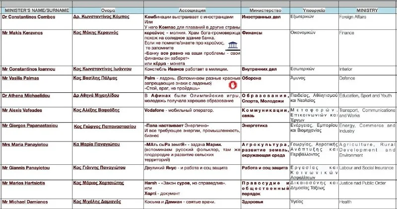 На Кипре сначала долго "варили макароны" (Макариос), потом "Кипр" (Киприану) взял эстафету, затем пришла "Василиса" (Василиу) на короткий срок, после чего "чистый лист" (Клиридис) правил 10 лет. Потом "Папа" (Пападопулос) и "Христос" (Христофиас) по 5 лет, "Анастасия" (Анастасиадис) снова на 10 лет, и теперь "новый Христос" (Христодулидис).