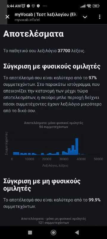 про английский тест мне написал, что я знаю 6400 слов, а про русский - 90000. но английский я знаю на Б2, а греческий - на А2.