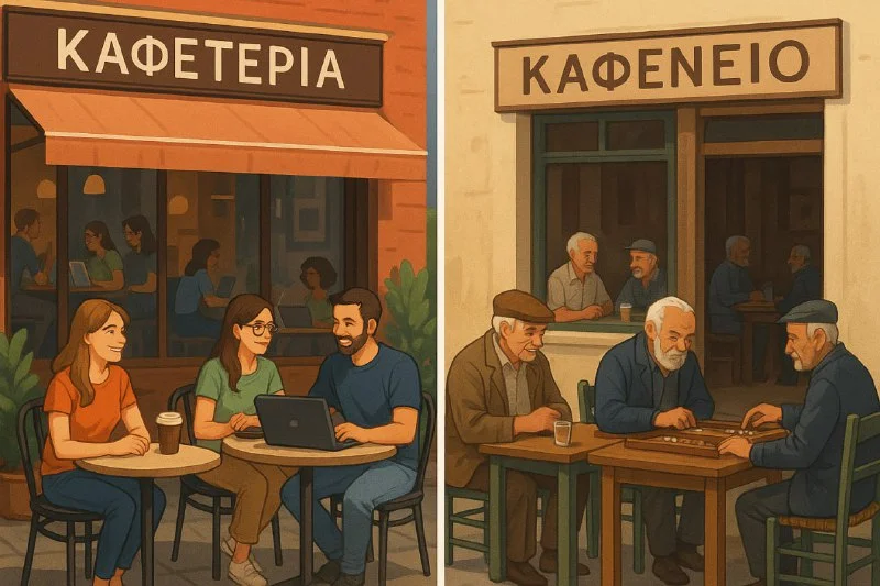 Попросил ЧатГПТ визуально изобразить разницу между **η καφετέρια** и **το καφενείο**. По-моему прико...