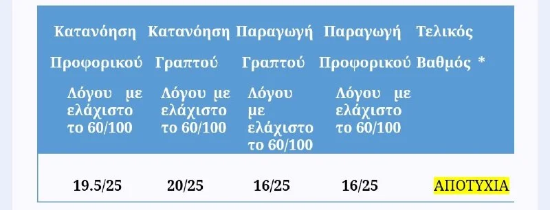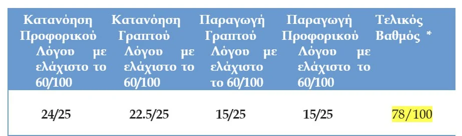 Υπενθυμίζουμε ότι για την επιτυχία στην εξέταση απαιτείται βαθμολογία ίση ή μεγαλύτερη του 60% σε κάθε δεξιότητα ξεχωριστά, ακόμη και αν ο συνολικός τελικός βαθμός είναι ίσος ή μεγαλύτερος του 60%.