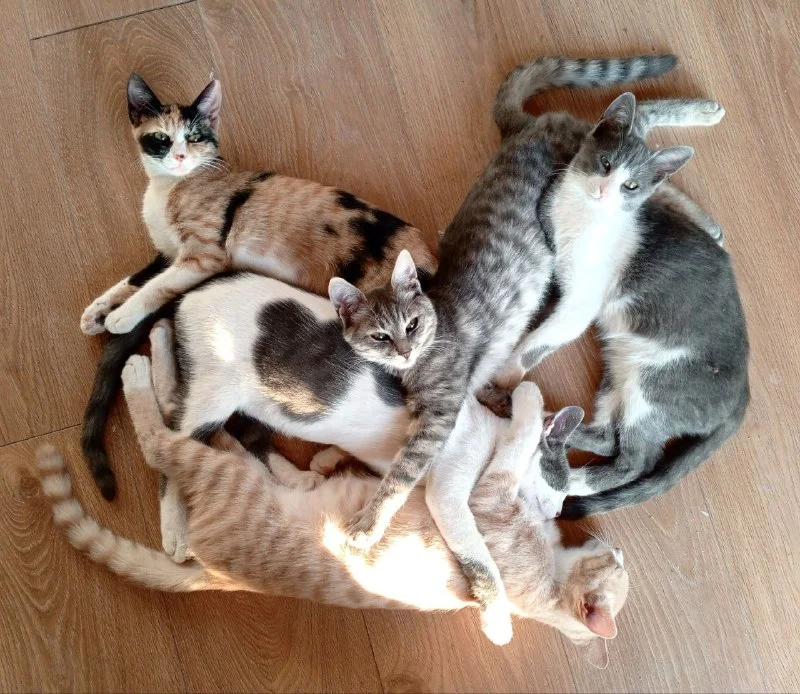 1 мальчик (бело-серый) и 3 девочки (серая, трехцветная, серо-белая).