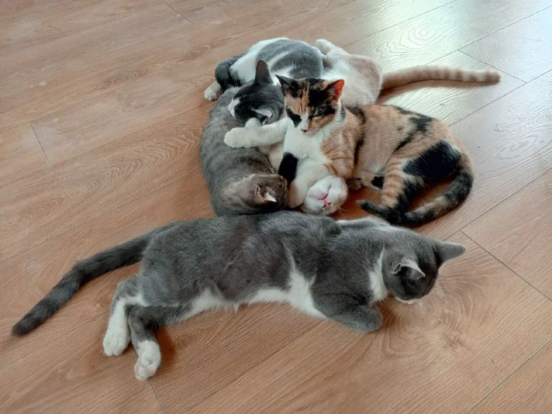 Бесплатно отдаю котят (1 мальчик бело-серый и 3 девочки - серая полосатая, трёхцветная, серо-белая), всем почти 5 месяцев.