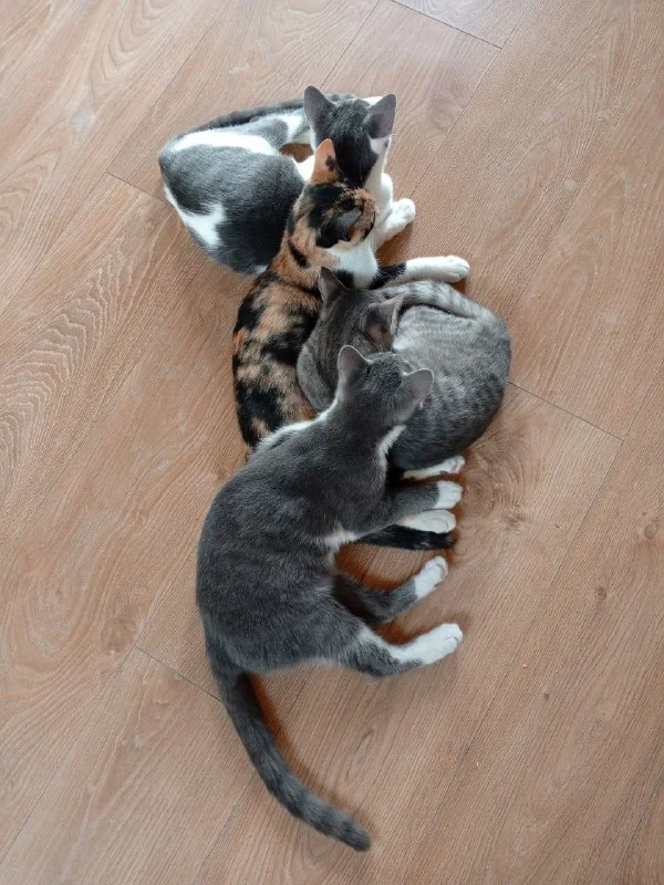 1 мальчик (бело-серый) и 3 девочки (серо-полосатая, трехцветная и серо-белая). В основном питаются сухим кормом.