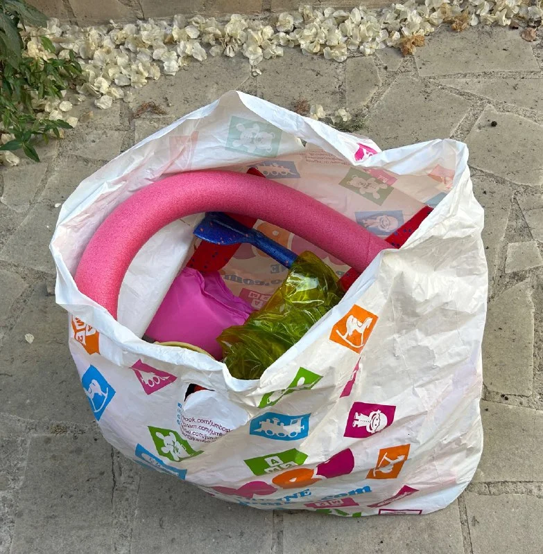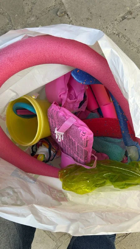 Пакет летне-пряжных игрушек для ребенка: ведерко, формочки, надувные круги, самолетик и прочее