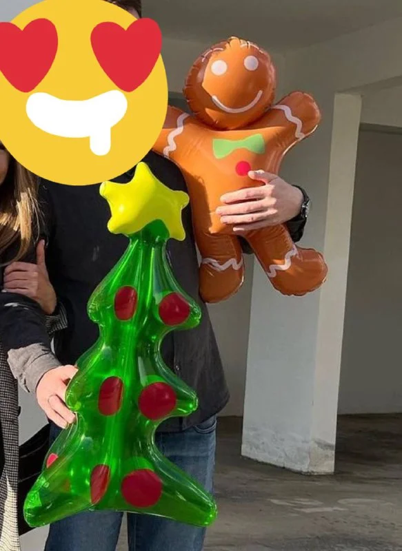 2 пряничных человечка и надувная елка.