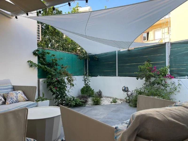 квартира с 2 спальнями, уютная веранда с небольшим садиком, 200 м от моря, 70 евро сутки/ 1350 евро в месяц. Рядом Caffe Nero, Redisson Beach Hotel.