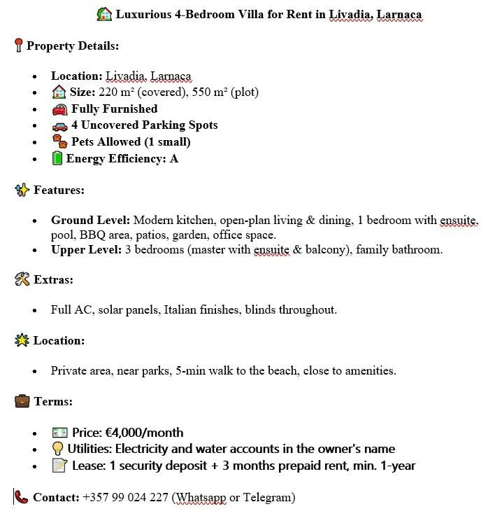 Luxurious 4-Bed Villa in Livadia, Larnaca. 220m², fully furnished, pool, 4 parking spots, pets allowed. €4,000/month.