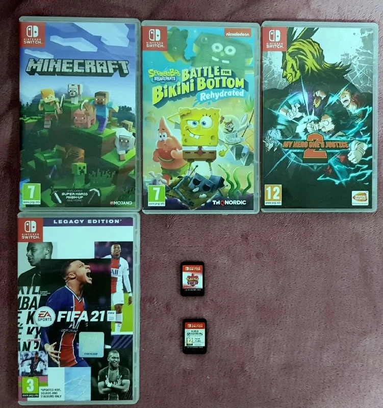Minecraft €50, Spongebob €40, Jstars €20, Fifa 21 €20, Super smash bros €50, Pokemon €40