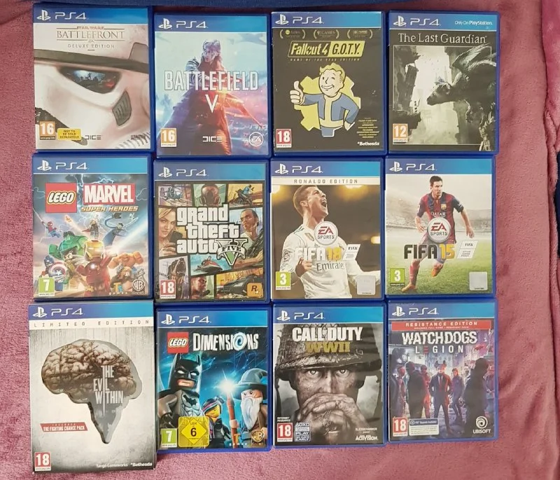 Star Wars €10, Battlefield V €20, Fallout 4 €10, Last guardian €20, Marvel Super Heroes €25, GTA5 €25, Fifa 18 €10, Fifa 15 €5, The Evil Within colllector edition €50, Lego Dimension €25, Call Of Duty ww2 €25, Watchdogs legion €35, Fifa 21 €15