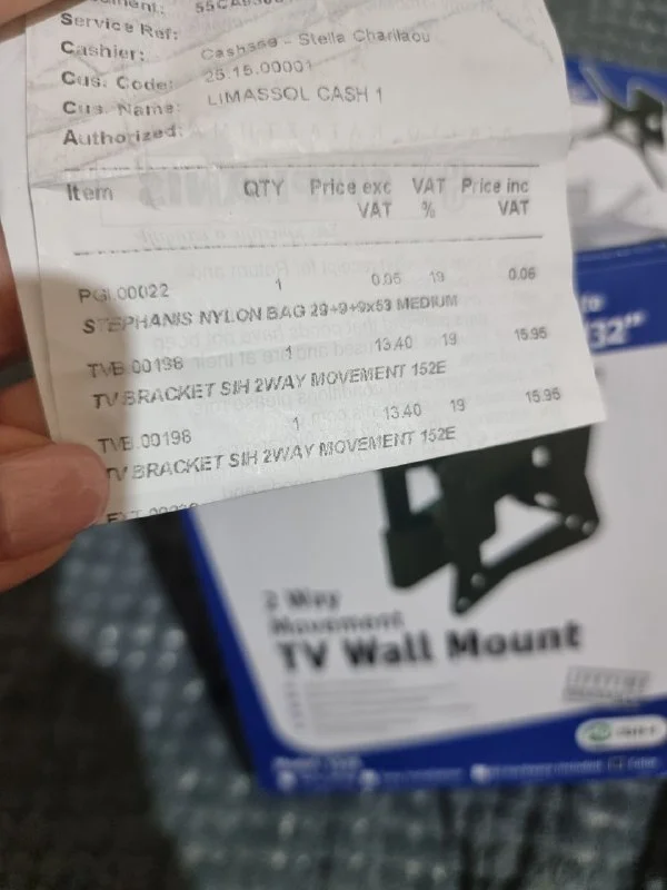 В виду переезда продаём кронштейн для тв для безопасной и быстрой и быстрой установки. В наличии 2 штуки. Покупали каждый за 15.95 евро. Чек на последней фото. Отдадим за 20 евро обе. Или по 10 за каждую. Лимассол. Гермасойа