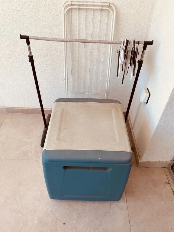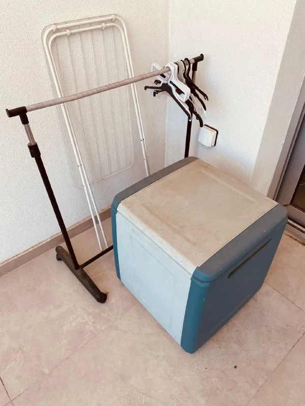Продается набор: большой пластиковый ящик для улицы и дома (размеры 65*65*65 см), сушилка для белья/полотенец, наполная вешалка, вешалки. Цена 25 евро за все вместе, Лимассол.