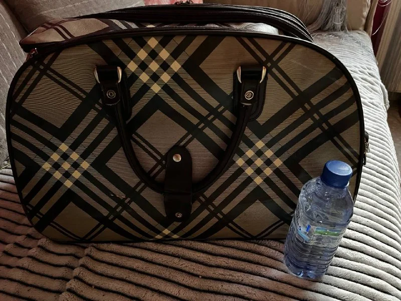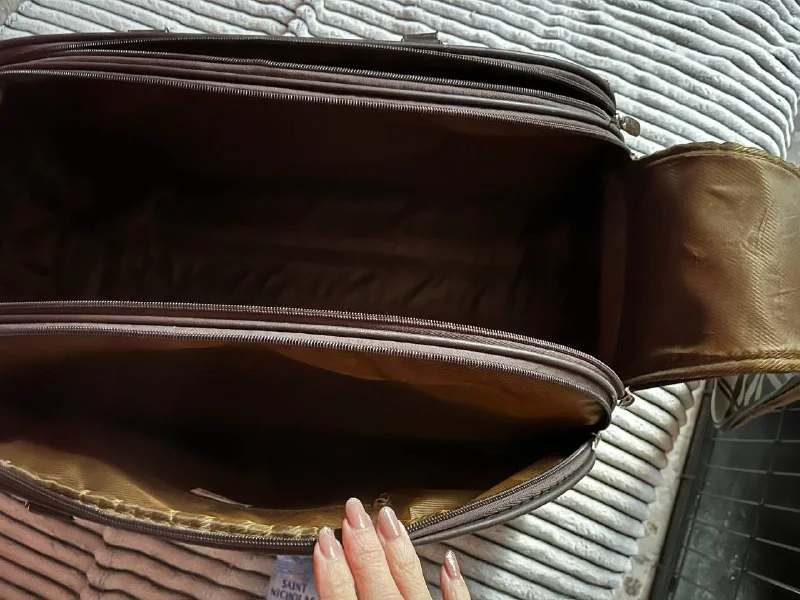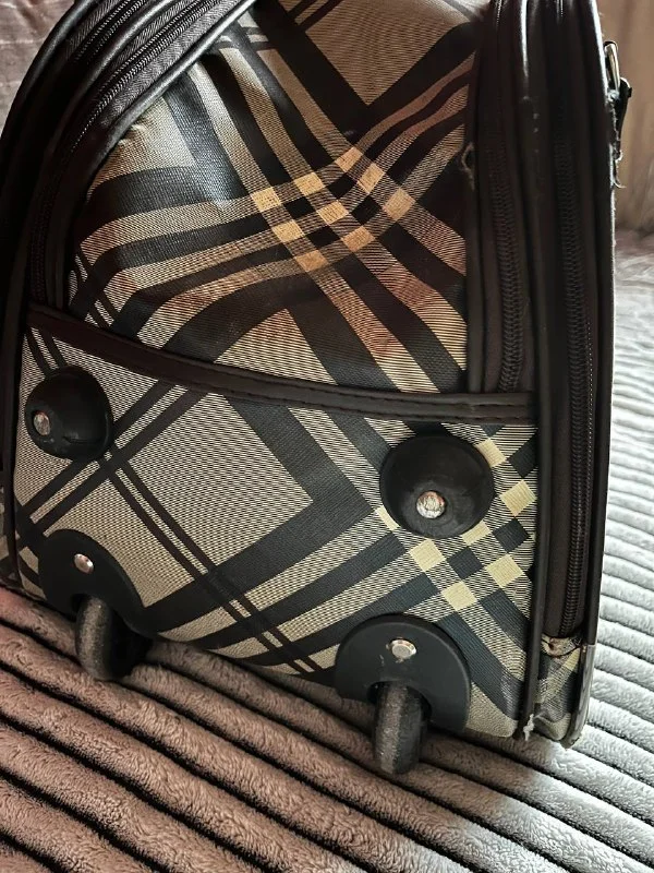 Сумка на колесиках. С обеих сторон карманы на молнии (постаралась на фотке передать размер открытого отделения). Немного потёрты края на отделке, но на ее прямые обязанности это не влияет 🙂. 15 евро. Лимассол