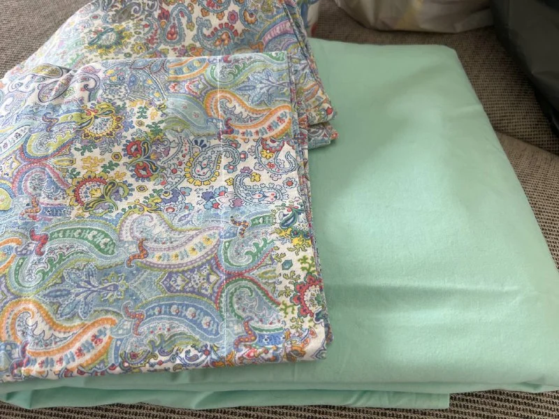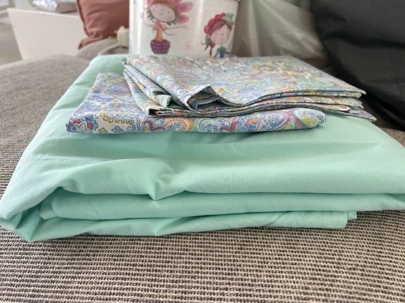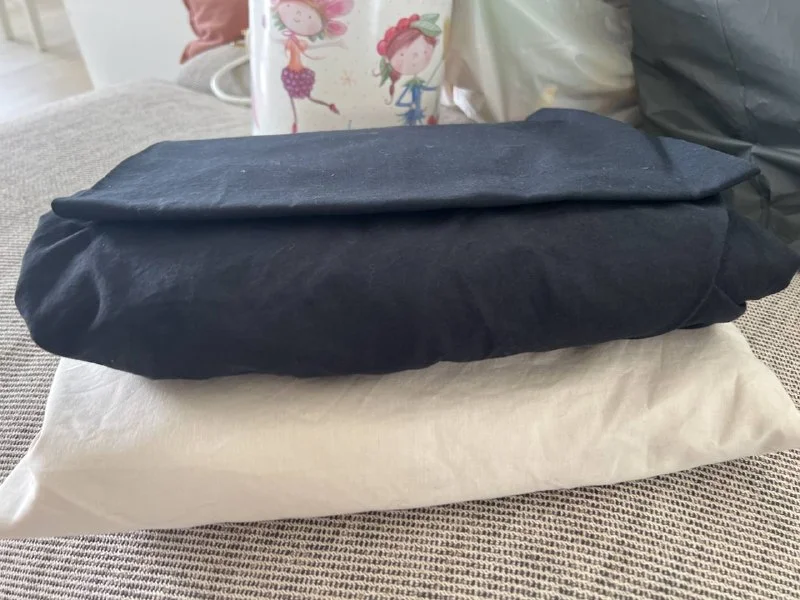Две односпальные простыни на резинке и одна чёрная наволочка.