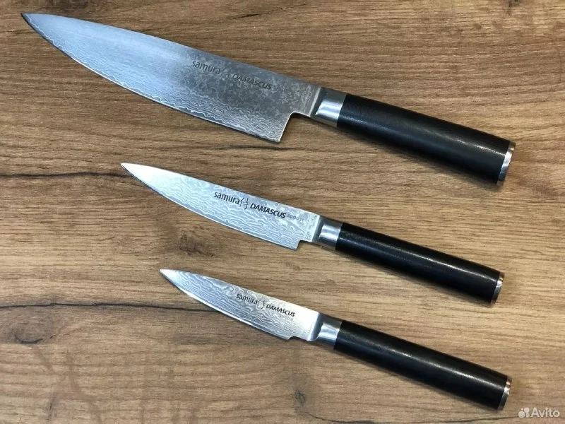 Продаю шикарную поварскую тройку Samura Damascus. Шеф, универсальный и овощной нож. Сердцевина VG-10 в обкладках из дамаска. Профессионально заточу в бритву.