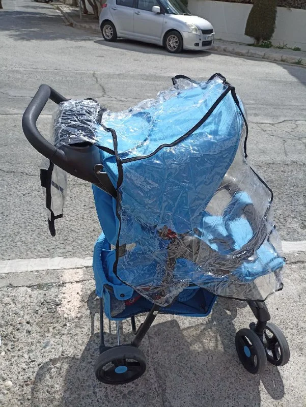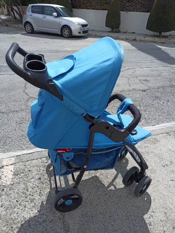 Голубая прогулочная коляска,три положения спинки,ремни безопасности, оригинальный дождевик и ветровик, корзина для покупок. В идеальном состоянии.