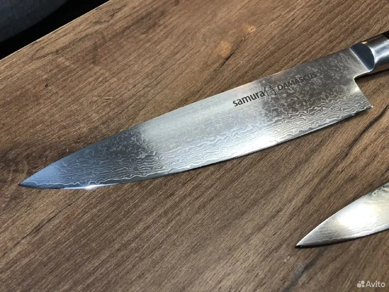 Продаю шикарную поварскую тройку Samura Damascus. Шеф, универсальный и овощной нож. Сердцевина VG-10 в обкладках из дамаска. Профессионально заточу в бритву.Прайс за сет - 300€.