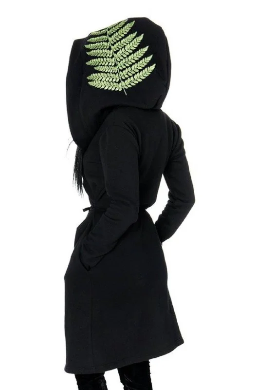 Очень теплая и очень мягкая внутри. Зауженный в талии и расклешенный к низу. огромный капюшон с большой реалистичной вышивкой папоротника.
