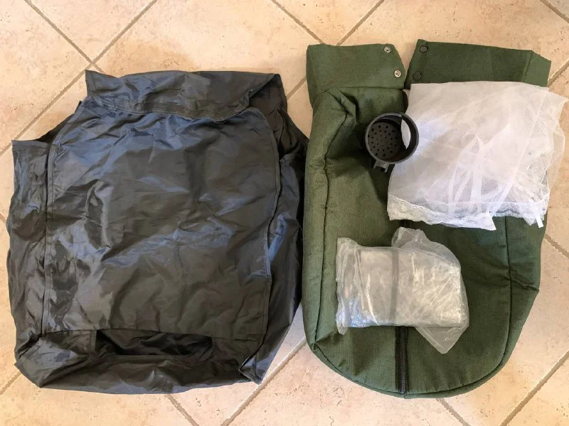 В комплекте держатель для стаканов, пленка от дождя, сетка от комаров, на холодную погоду защита для ног, челхол для коляски для перевозки.