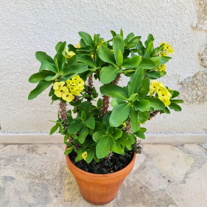Роскошный куст Эуфорбии Миля. Цветет большую часть года. Подходит для солнечного места в доме, на балконе или в саду. Выдерживает кипрскую жару летом и холодные дожди с градом зимой (если растить под открытым небом). Горшок керамический. Высота куста 80 см, возраст 5 лет. Пафос, 50 евро.