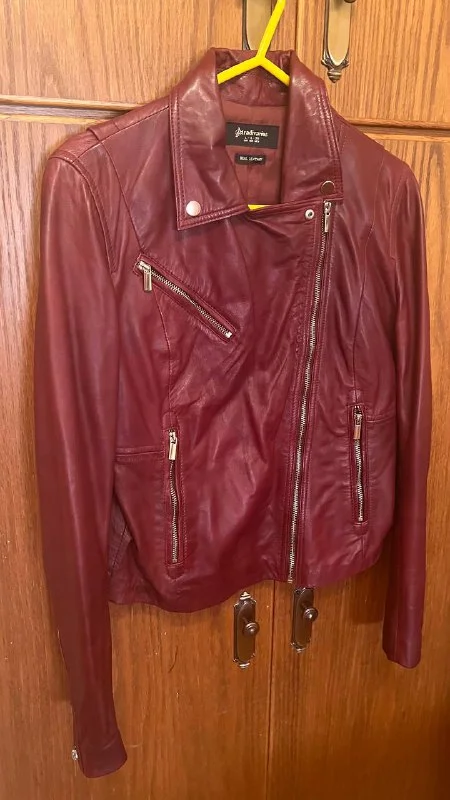 Куртка из натуральной кожи a Stradivarius, никогда не надевалась, в идеальном состоянии, потрясающего бордового цвета,размер L, €55. Лимассол.