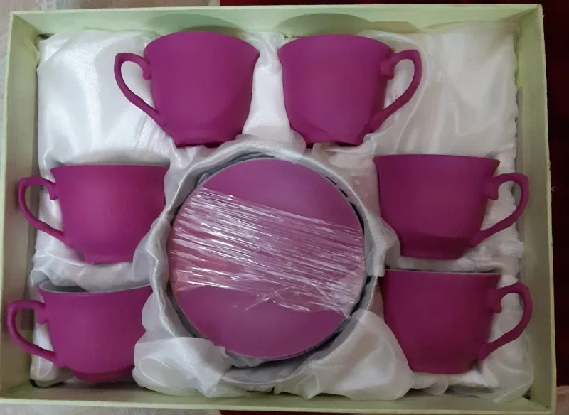 Кофейный сервиз на 6 персон. Очень милый, красивого яркого цвета. Новый. Диаметр блюдца — 11 см, высота чашечки — 5 см. 10 €. Лимасол, самовывоз.