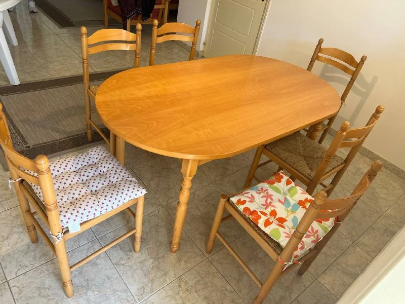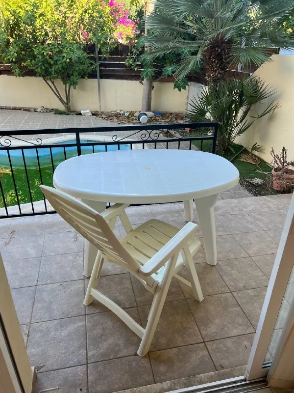 Стол и 4 стула , отличное качество , Толстое стекло и металл. Подушки съемные на стульях легко перетянуть в нужный цвет. Цена :800 евро Корал Бей