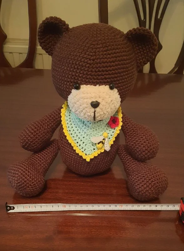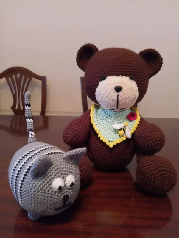 Собственноручно связанные игрушки. Эксклюзив, в единственном экземпляре. Мишка примерно 30 см в высоту, котик - 15 см.