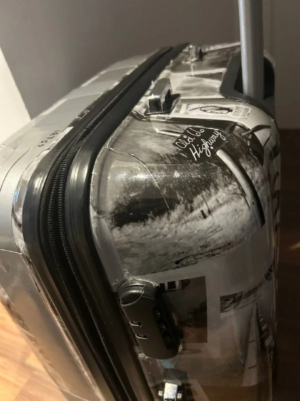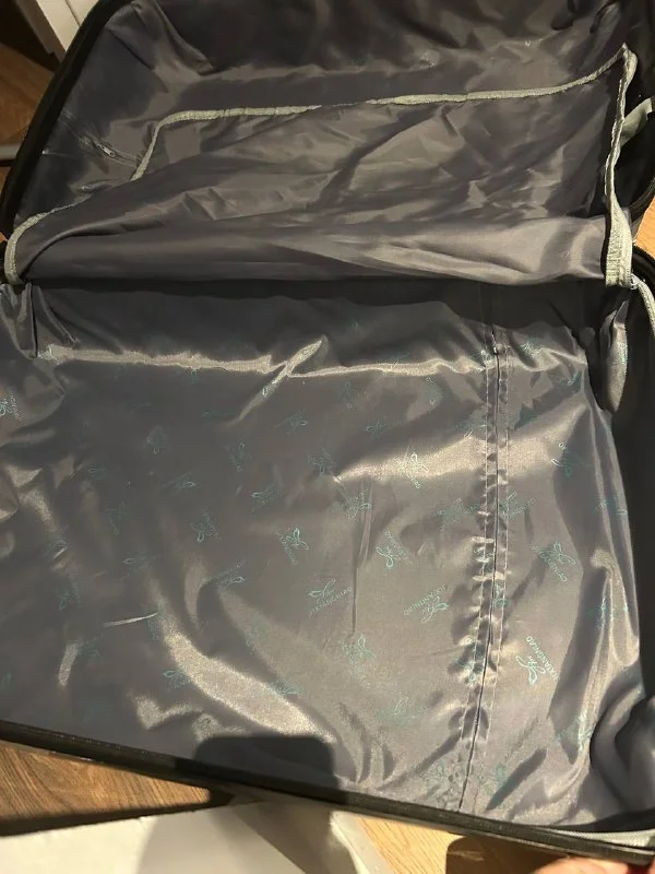 Уставший чемодан размера L, пластик, «укреплен» серебристым скотчем, потому что в аэропорту при транспортировке повредился каркас в районе одного колеса, внутри чисто, ручка выдвигается легко, кодовый замок , катить можно, поставить только к стенке , есть удобная ручка на боку.