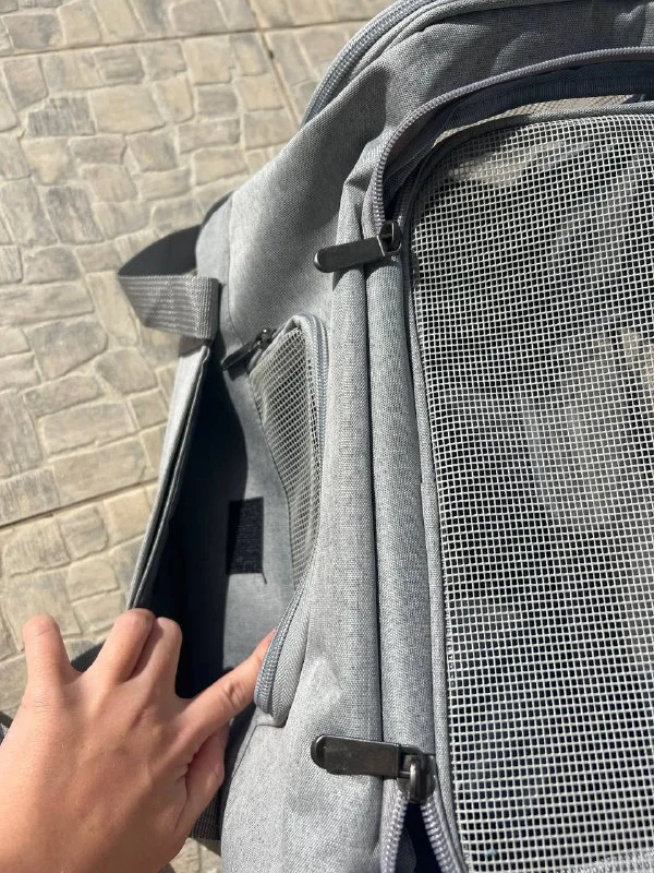 Сеточка со всех сторон переноски, открывается с трех сторон, 2 отсека для хранения мелких вещей, фиксатор за поводок внутри переноски и мягкая непромокаемая подкладка.