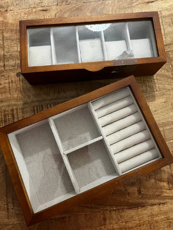 Два футляра для хранения украшений и часов , натуральное дерево, новые , в одном там где для часов не хватает подушечки при переезде потерялась и есть след от скотча, которым сматывали про проезде ( нужно только снять скотч) стоили оба около 100 евро оба, отдам за 30 💶 в одни руки