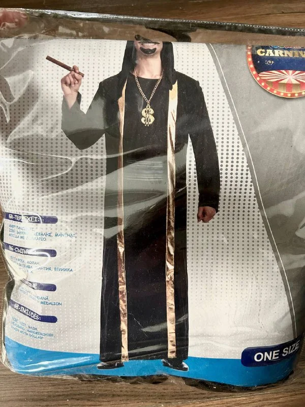 В комплект входит: халат, жилет, повязка на голову и носовой платок, за исключением усов и очков.