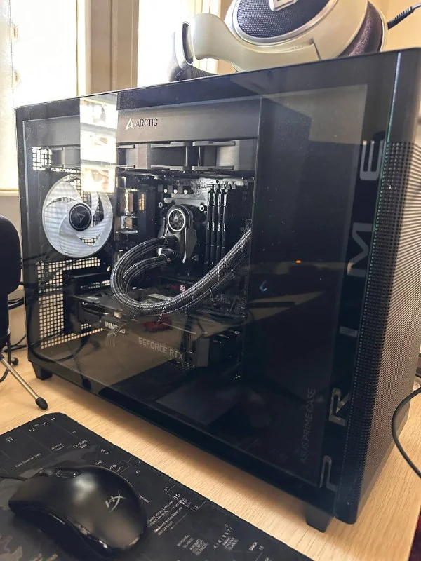 Хорошо тянет современные игры и тяжелые программы, а благодаря водяному охлаждению не греется. Использовался в основном для фотошопа и After Effects. Собран в стильном и компактном корпусе Asus AP201 Prime. Материнская плата с wifi и bluetooth. Быстрый SSD m2 на 1ТБ. Все комплектующие покупались новыми.