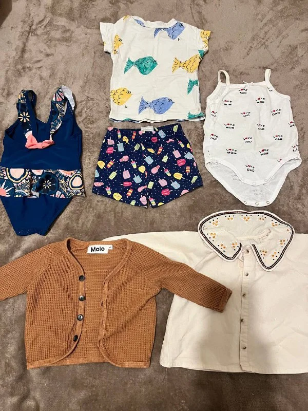 Платье, комбинезон, слипы, кофточки, купальник, ботиночки, шапочки, спальный мешок, другие мелочи. Все в хорошем состоянии. Многое надевали 1 раз.