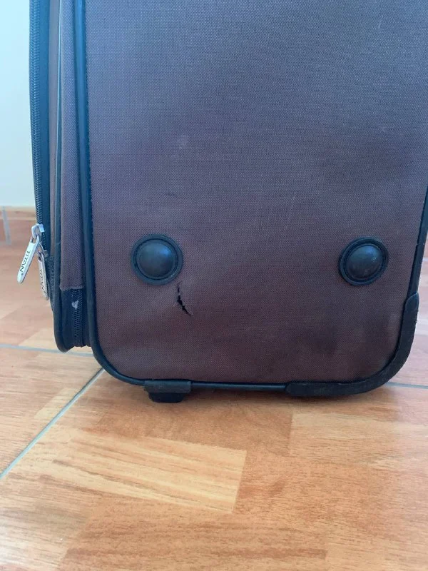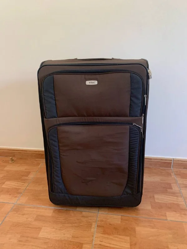 Чемодан Titan с выдвижной ручкой, на колесах. Всё работает, внешнее состояние на 3, дефект на фото (порез на внешней ткани, несквозной). Размер L, высота около 70см.