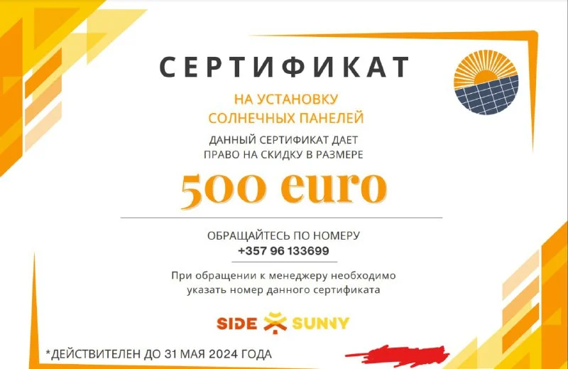 Продаю сертификат на установку солнечных панелей со скидкой 500€. Выиграл на одном бизнес-мероприятии. Себе на дом установить не могу.