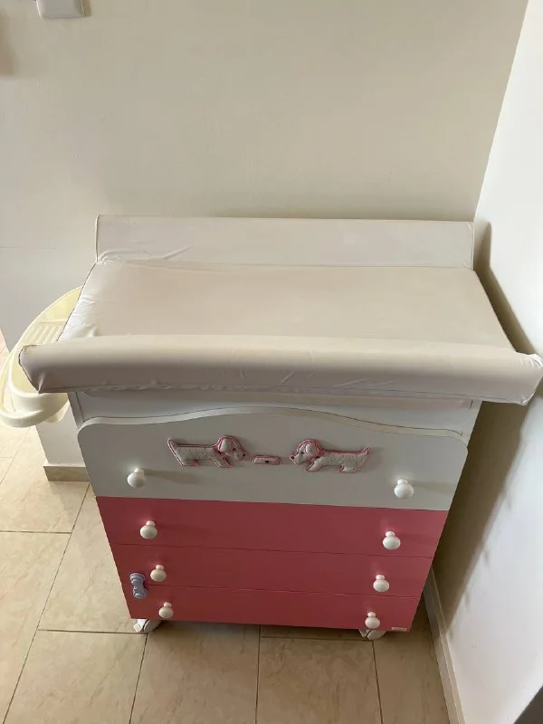 Детский комод с ванночкой и пеленатором в комплекте плюс навесной органайзер для мелких вещей. Высота от пола 90, длина 73, глубина 43. Ванночка убирается, пеленатор снимается. На колесиках есть фиксаторы стопы. На задней стенке есть маленькое повреждение, коцнули при сборке, не влияющее на функционал и внешний вид. Механизмы не заедают, дно ящиков не просевшее, использовался бережно, состояние очень хорошее. Цена так снижена, потому что уехали с острова, а он остался у друзей.