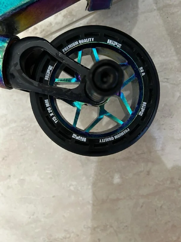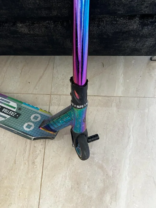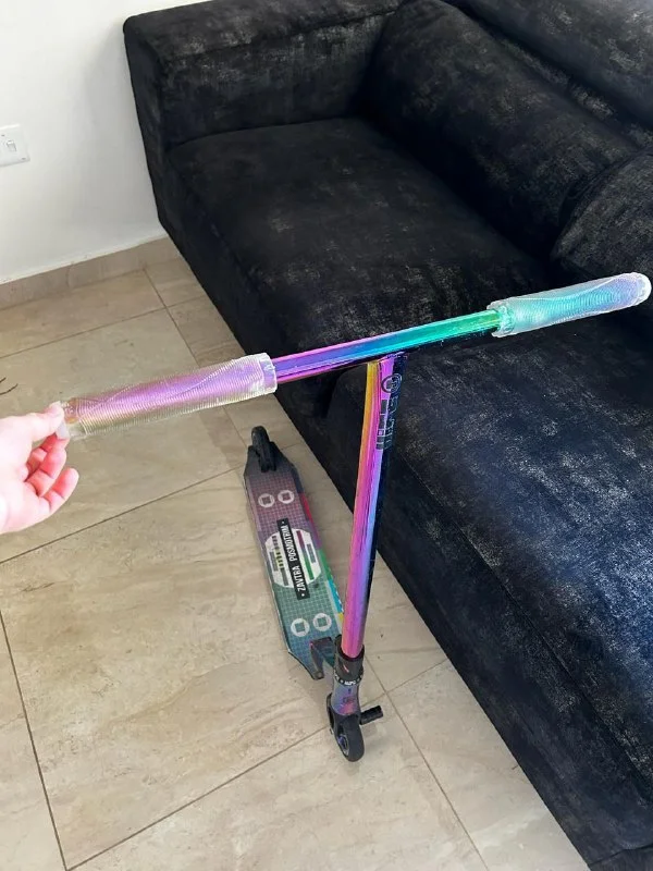 Самокат трюковой.Уже проходил два раза техобслуживание, меняли грипсы на прозрачные и шкурку .(Было техобслуживание смена потшипников на колёсах и в руле)