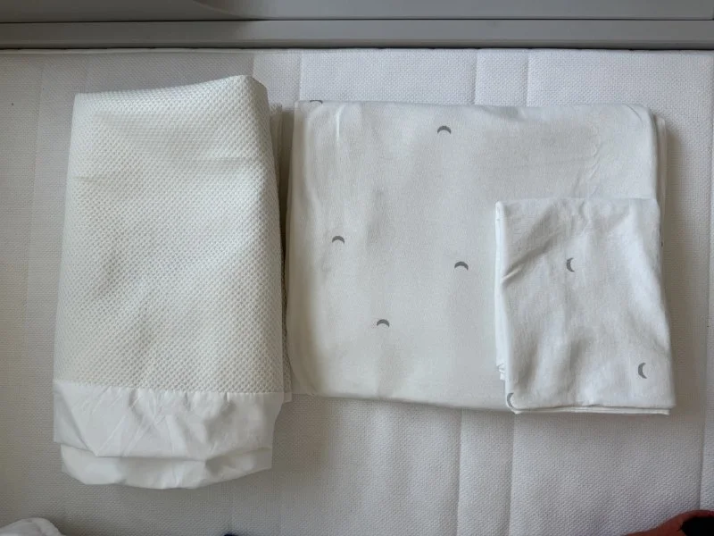 Комплект постельного белья детский: наволочка, пододеяльник, водонепроницаемый наматрасник.