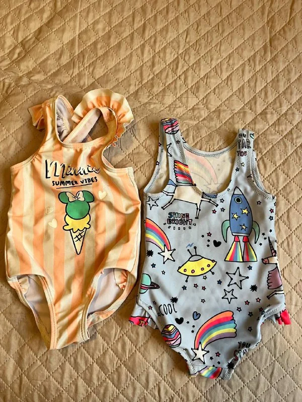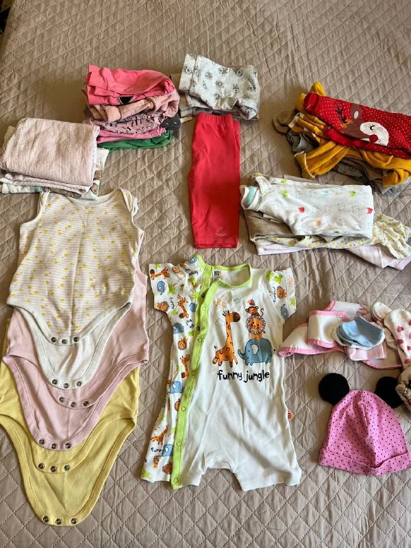 Из одежды: бодики, слипы, летние и теплые, много штанов, кофточки, мелочи (носочки, шапочка, слюнявчик), куртка, купальники.
