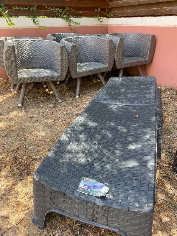 Стол + 4 кресла + зонтик с новой тканью и утяжелитель внизу под столом для крепежа зонтика, продаю за 199 евро + приставной "белый" сервировочный столик в ПОДАРОК 🎁