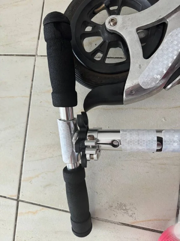 Швейцарец, все рабочее. Шины не спускают. Удобно ездить по неровностям - зубы не стучат. Компактный и легкий - до 5 кг. Высота ручки 103см, вес до 100 кг